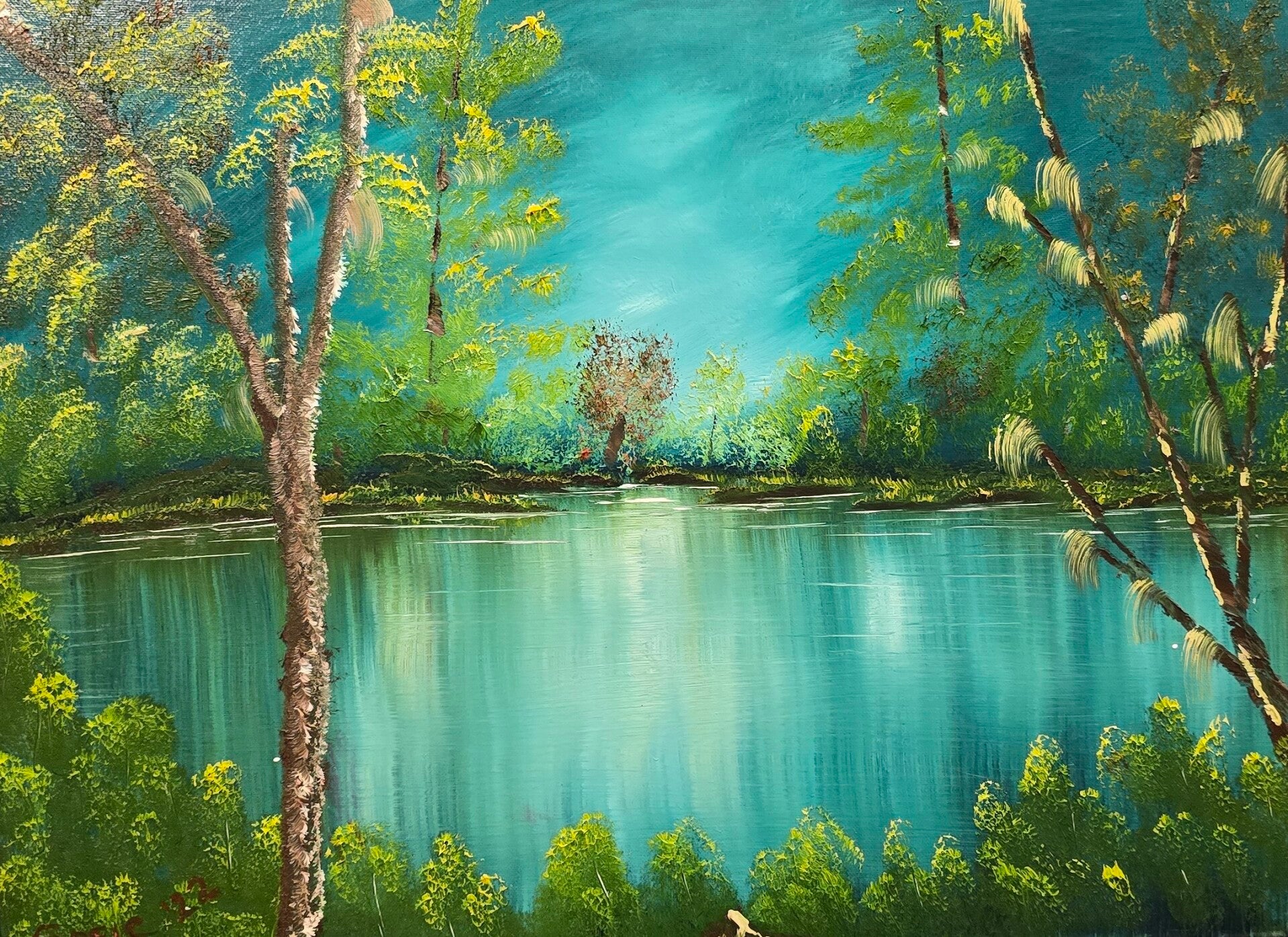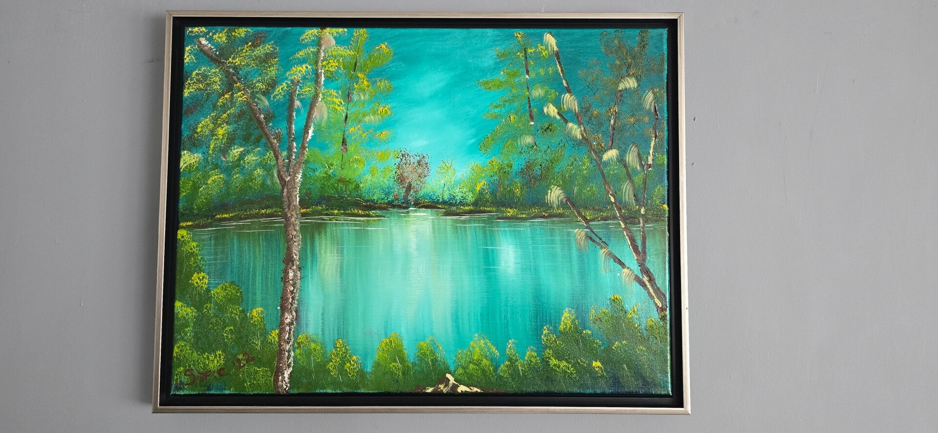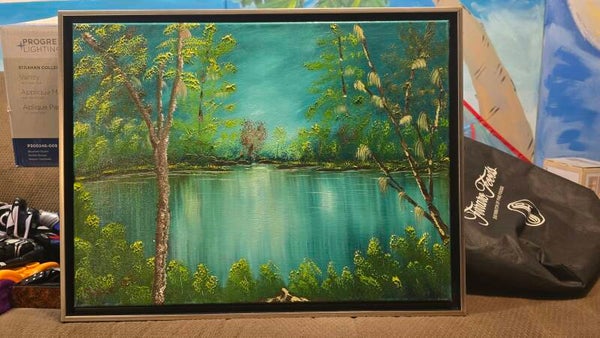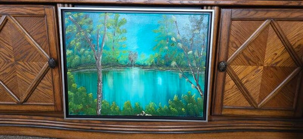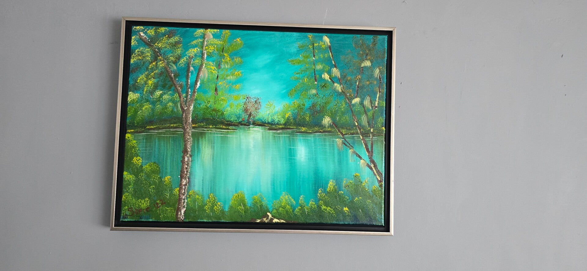 Original oil painting signed by artist and. One of a kind. 18 by 24 inches on streched canvas. Framed. Free shipping. Framed