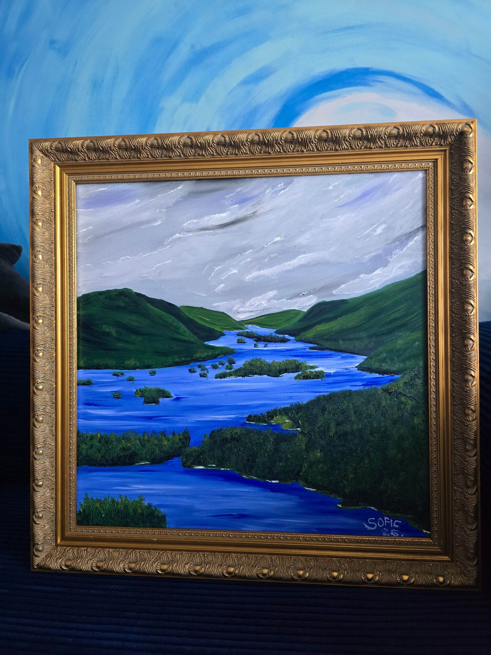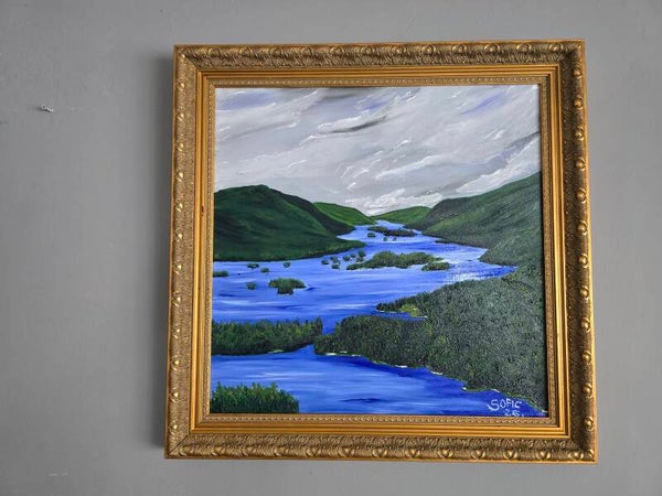 Original oil painting signed by artist and varnished. One of a kind. 20 by 20 inches on stretched canvas. Framed. Free shipping . For purchase contact Old Forge View art center phone number 315-369-6411